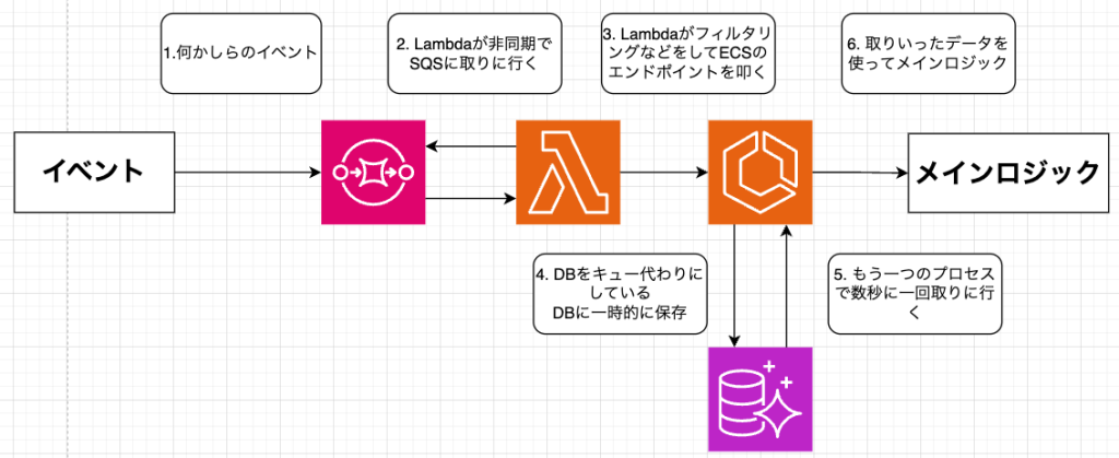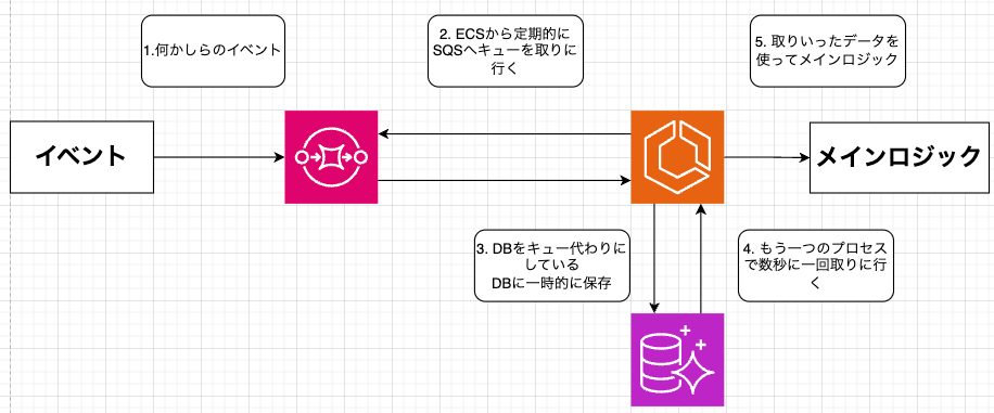 SQSキューをECSサービスが直接監視し、メッセージを取得してメインロジックを実行します。数秒ごとにSQSを見に行き、RDSに保存するプロセスと保存したRDS上のデータを取りに行きメインプロセスを実行する二つのプロセスが必要になります。