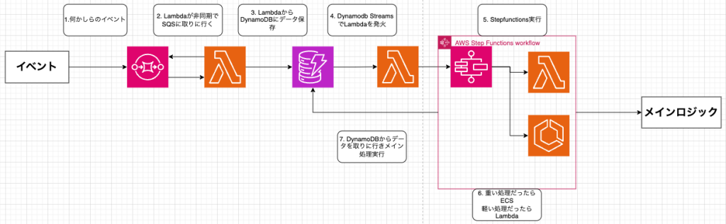 この構成では、Lambdaはあくまでフィルター兼ディスパッチャーであり、ECSのAPIプロセスがデータの一次受け付けとキューイング(RDS利用)、ECSのWorkerプロセスが実際の非同期処理を担当します。